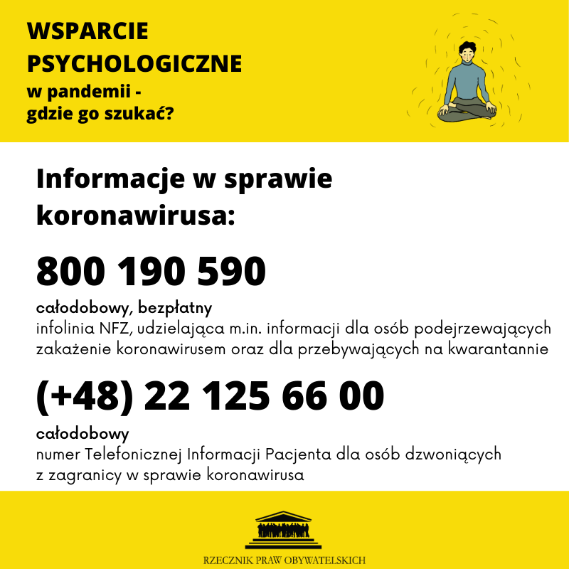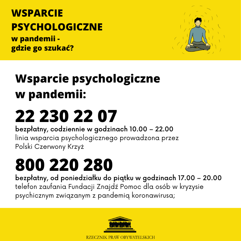 Na infografikach znajdują się opracowane przez Biura Rzecznika Praw Obywatelskich numery telefonów do specjalistów i specjalistek, gotowych pomóc, gdy czujemy, że pandemia nas przytłacza, a stres związany z obawą o pracę, naukę, zdrowie ludzi, których kochamy, bezpieczeństwo finansowe i inne aspekty życia codziennego zaczyna nas przerastać. Reaguj.